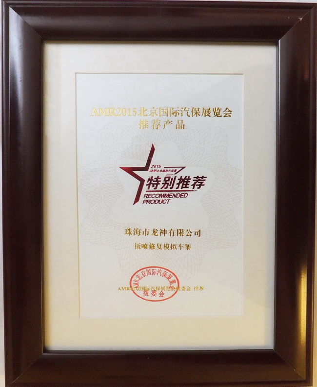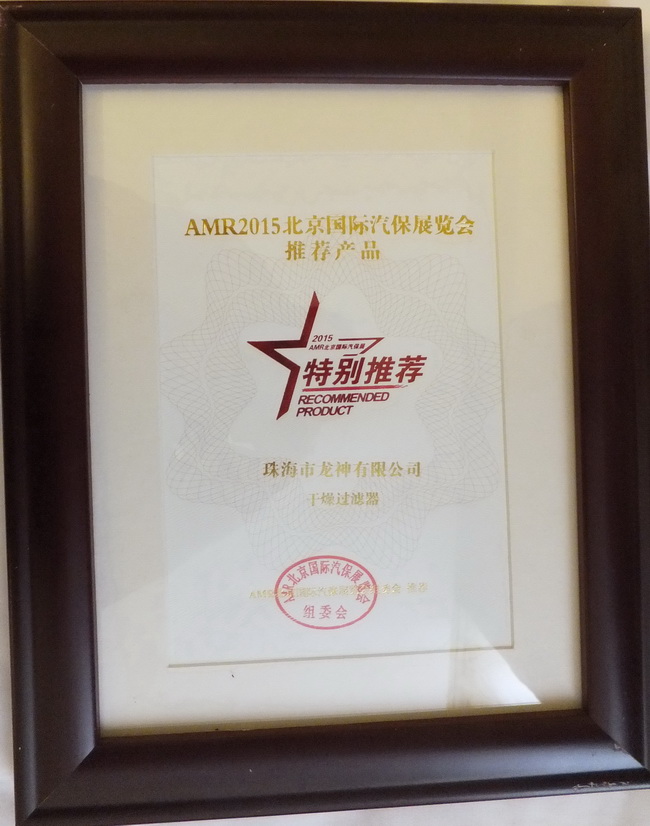 2015年4月8日,2014年度“20佳汽保產品”、“20佳維修工具”、AMR2015北京國際汽保展推薦產品頒獎晚宴于北京成功舉辦。珠海龍神“干燥過濾器”,“鈑噴修復模擬車架”榮獲ARM2015北京國際汽保展覽會推薦產品獎。